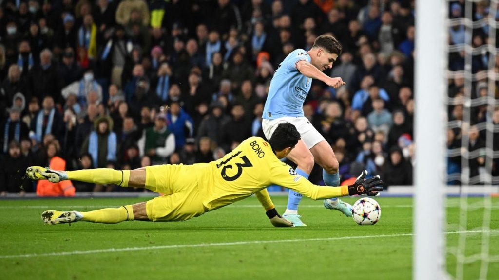 Después, a los 25 minutos del segundo tiempo y con el Sevilla volcado al ataque (perdía 1 a 0 con tanto del español Rafa Mir a la media hora del primer tiempo), el belga Kevin De Bruyne habilitó a Álvarez con un pase largo para que el argentino gambeteara al arquero y definiera de zurda desde un ángulo cerrado. Unos minutos después el ex-River Plate habilitó a Riyad Mahrez tras otra recuperación alta y el argelino marcó el tercero para los dirigidos por Pep Guardiola.