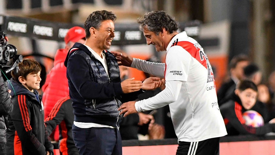 El entrenador Marcelo Gallardo iba a formar parte del primer equipo pero una molestia en la rodilla derecha que acusó a última hora solamente le permitió salir al campo de juego de civil para saludar a un público que nuevamente lo ovacionó.