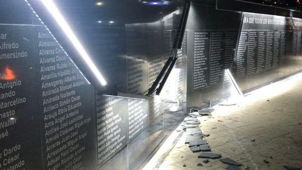 Las roturas se registraron donde se encuentra una pared de mármol iluminada con luces led, y sobre ella están escritos los nombres de los soldados argentinos fallecidos durante el conflicto bélico de 1982, junto a un recipiente del que emana una «llama eterna» en honor a los excombatientes.